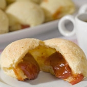Bata no liquidificador os 5 primeiros ingredientes, e adicione aos poucos o polvilho até ficar com consistência de massa de bolo. Coloque a massa em forminhas de empada untadas com oléo. Recheie com pedaços de queijo e goiabada. Leve ao forno pré aquecido e retire quando os bolinhos estiverem dourados.