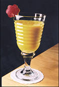 Esprema as laranjas em um espremedor e coloque o suco no liquidificador com a manga. Coe, volte para o liquidificador adicione o açúcar e o gelo e bata novamente.